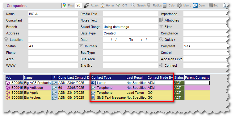 It is now possible to add some extra columns to the [Companies] workbench to display the Last Contact Method, and the UserID for who made this 'Last contact'