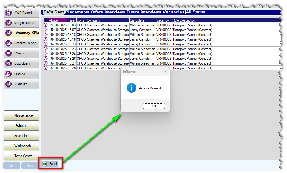 The ability to click the [Export to Excel] button from within Vacancy KPIs, Candidate RAG report and Client RAG report can now be controlled using UAC. This means that a specific user-list (User Access Control) can be assigned for each.