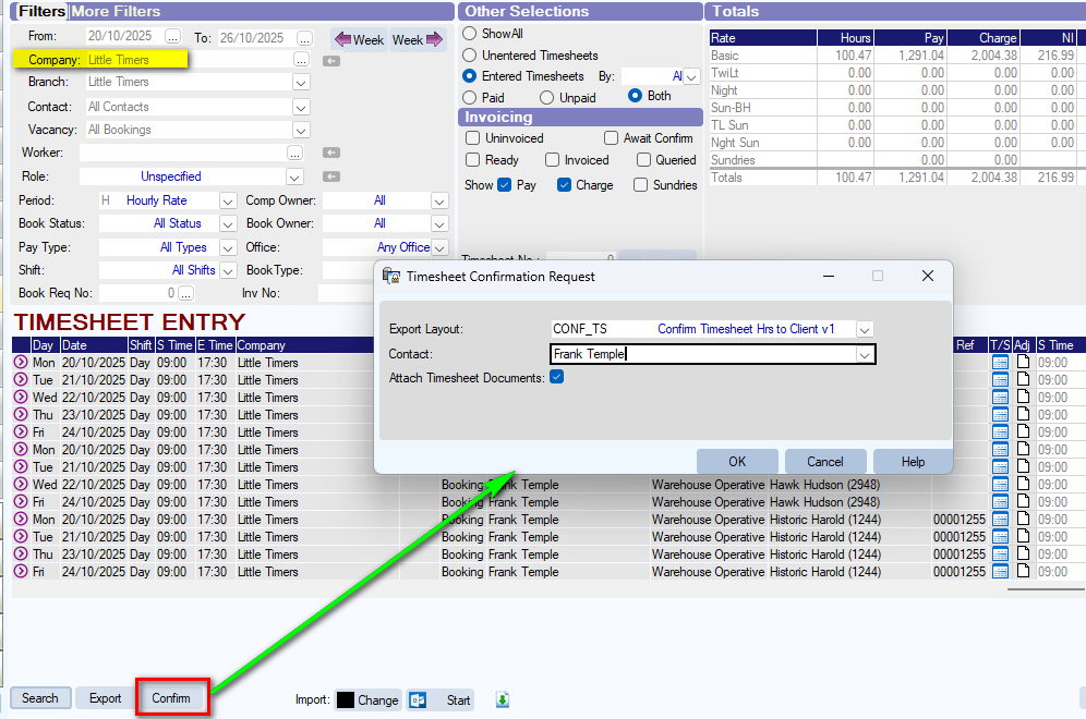 Within TIMESHEET ENTRY it is possible to send a confirmation email to a client, showing the hours entered for Temps who have worked at their site. This email is not enhanced to allow any actual timesheets which have been scanned/stored to be sent as a *.Zip file.