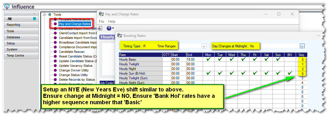 - Amended Global "Timed Rates" setup, so that it is now possible to specify if rates change at midnight (or not) on the Global setup. This allows for more flexible setup for shifts, such as the ability to pay "Bank Holiday" rate starting from 18:00 on 31st Dec (which is not a bank holiday) - Example of special "New Years Eve" shift setup is shown below.