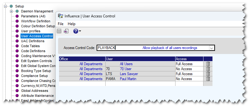 Users can be added to the UAC with FULL ACCESS (To play back ALL recordings) or NO ACCESS (To Play back only their own recordings).