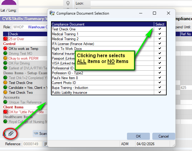 Clicking the paperclip at the bottom left of the worker [Compliance] tab allows users to select and Zip any of their compliance item documents. You can now select all or none very quickly, by clicking the column heading.