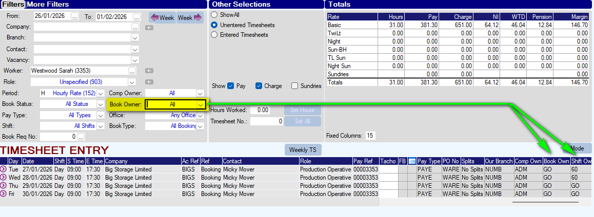 - Within the TIMESHEET ENTRY screen, there is a filter labelled "Booking Owner". This can now be controlled to look at either BOOKING OWNER <or> Shift Owner. The behaviour is controlled with parameter TEMPS, Flag(64)