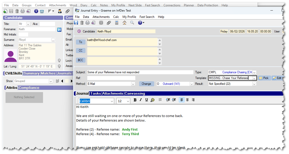 In this release, we have enhanced the Reference chasing. It is now possible to email candidates with details of any Referees recorded on their [Compliance] tab who have not yet returned their reference.