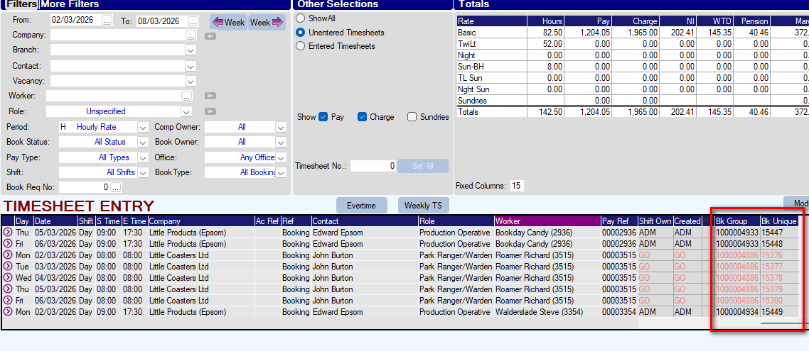 - Within TIMESHEET ENTRY it is now possible to display the Booking Group ID and Booking Unique ID at the right-hand end of the display. The new feature is activated with parameter TEMPS, Flag(65)