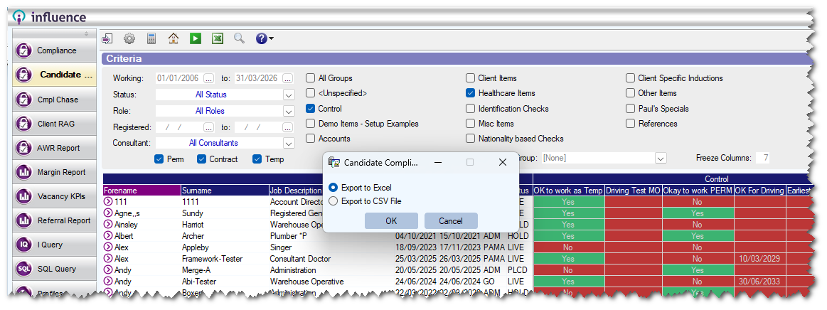 The candidate RAG report giving details of compliance, now allows users to choose whether to export to MS Excel, or to a csv file. The new choice is controlled with parameter RECC, Flag(54) and can be set to default to Excel, to csv, or to simply allow the user to choose.