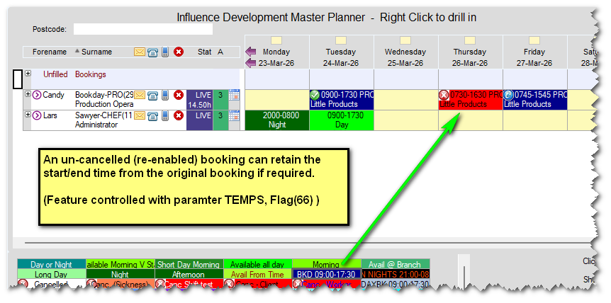 If a booking is added to the PLANNER, and then [Cancelled] using one of the option from the palette, the cancellation will show the times of the original booking (e.g. 07:45 - 15:45)